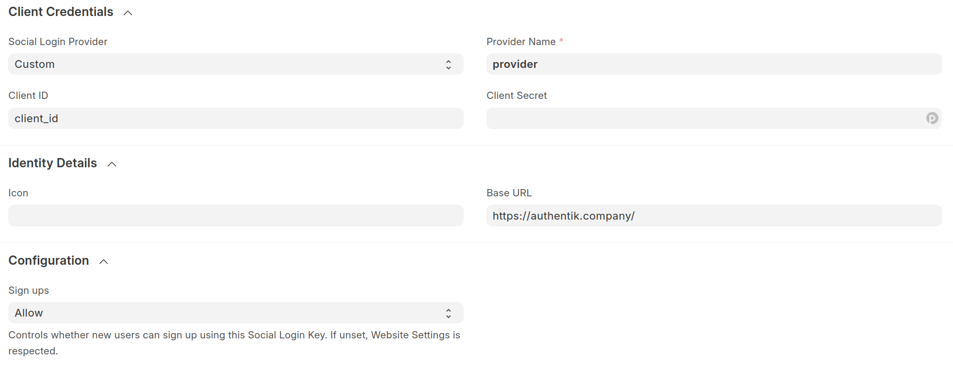 frappe.companyis the FQDN of the Frappe installation.authentik.companyis the FQDN of the authentik installation.provideris the name for the social login provider in Frappe.